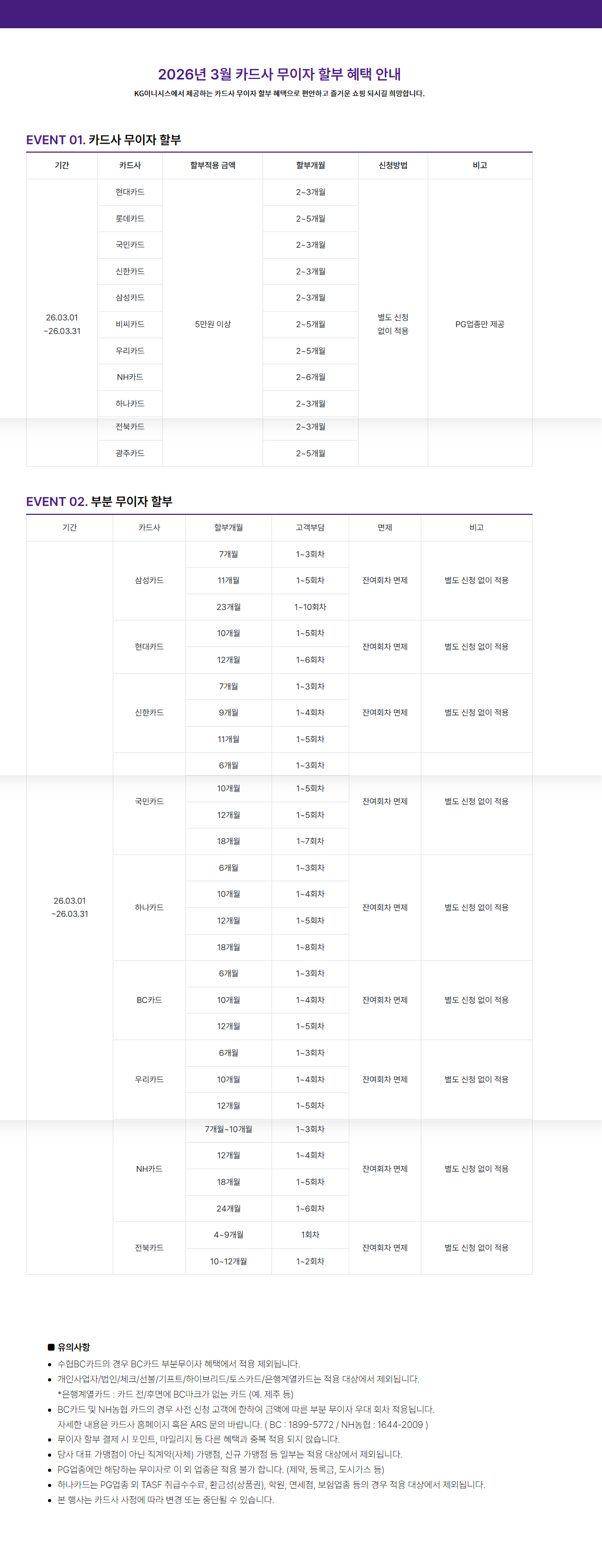 2026년 03월 카드사 무이자 할부 혜택 안내