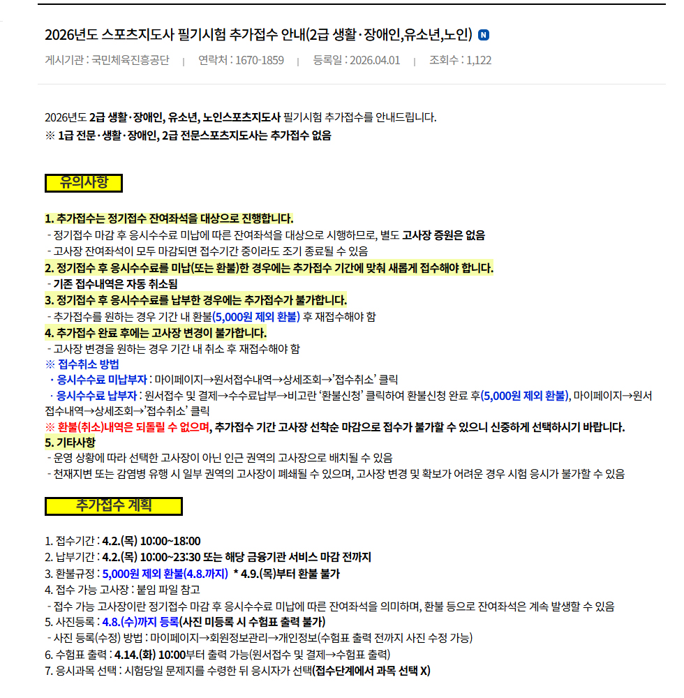 | 2026년도 스포츠지도사 필기시험 추가접수 안내(2급 생활·장애인,유소년,노인) |