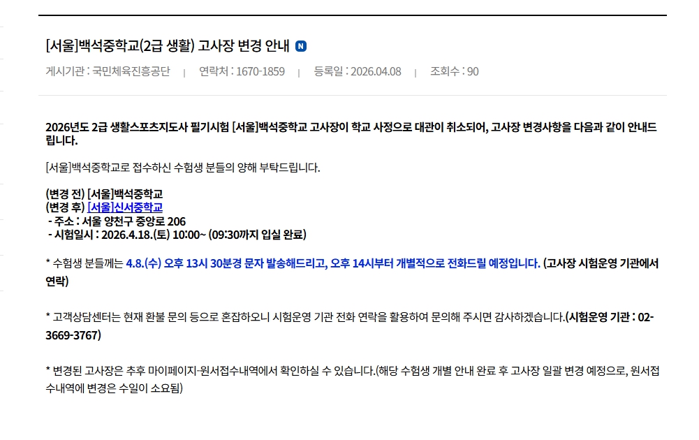 [서울]백석중학교(2급 생활) 고사장 변경 안내